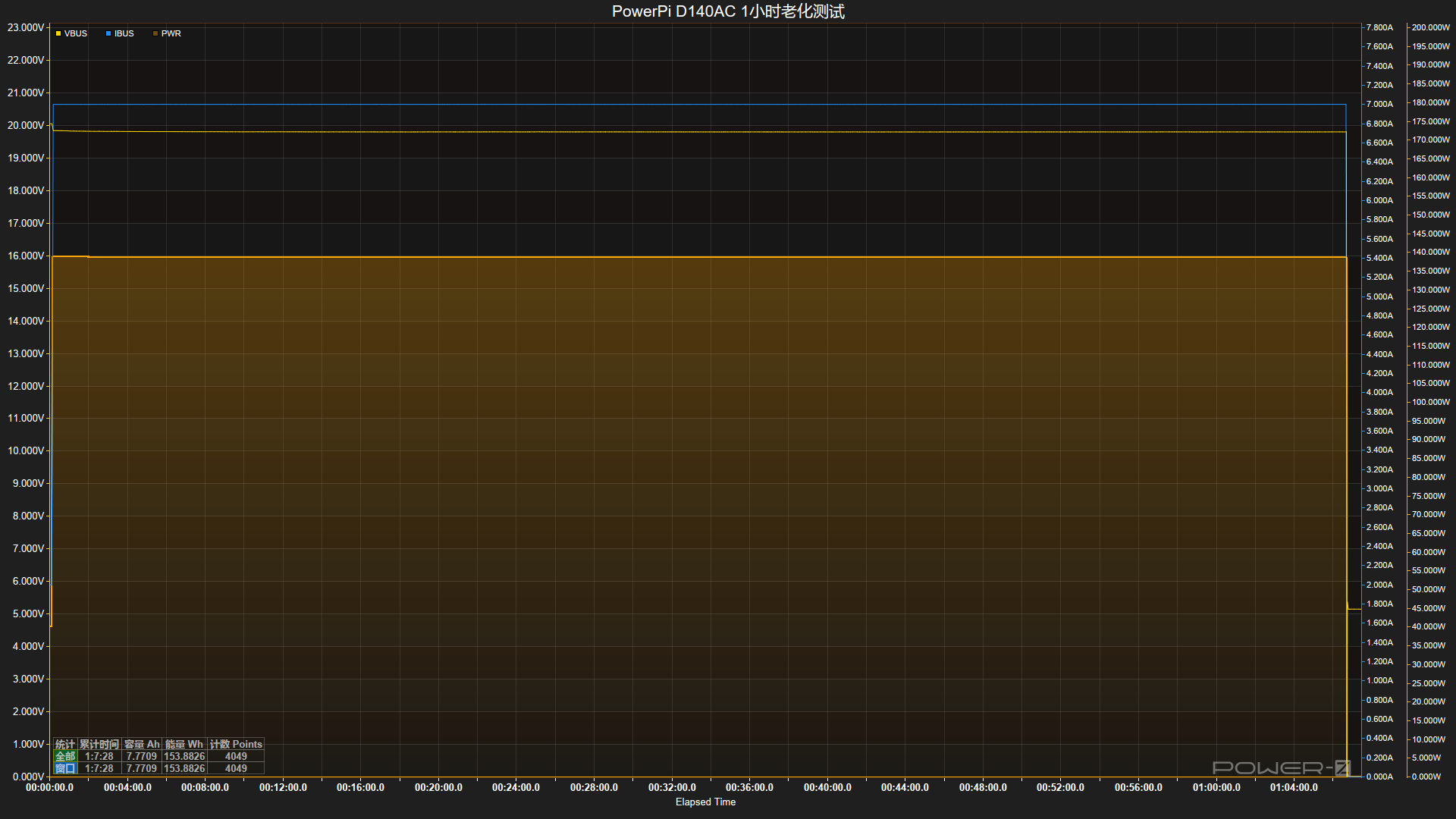 本次测试在25℃环境温度下,将模块置于桌面进行20V 7A 140W功率老化测试。使用POWER-Z KM003C的上位机软件进行记录,一小时老化测试中实测输出为19.80V 7.00A 138.64W,功率输出稳定,全程无降功率现象。温度控制表现亮眼,最高温度仅91.6℃,结合铝基板设计,展现出色的散热管控能力。